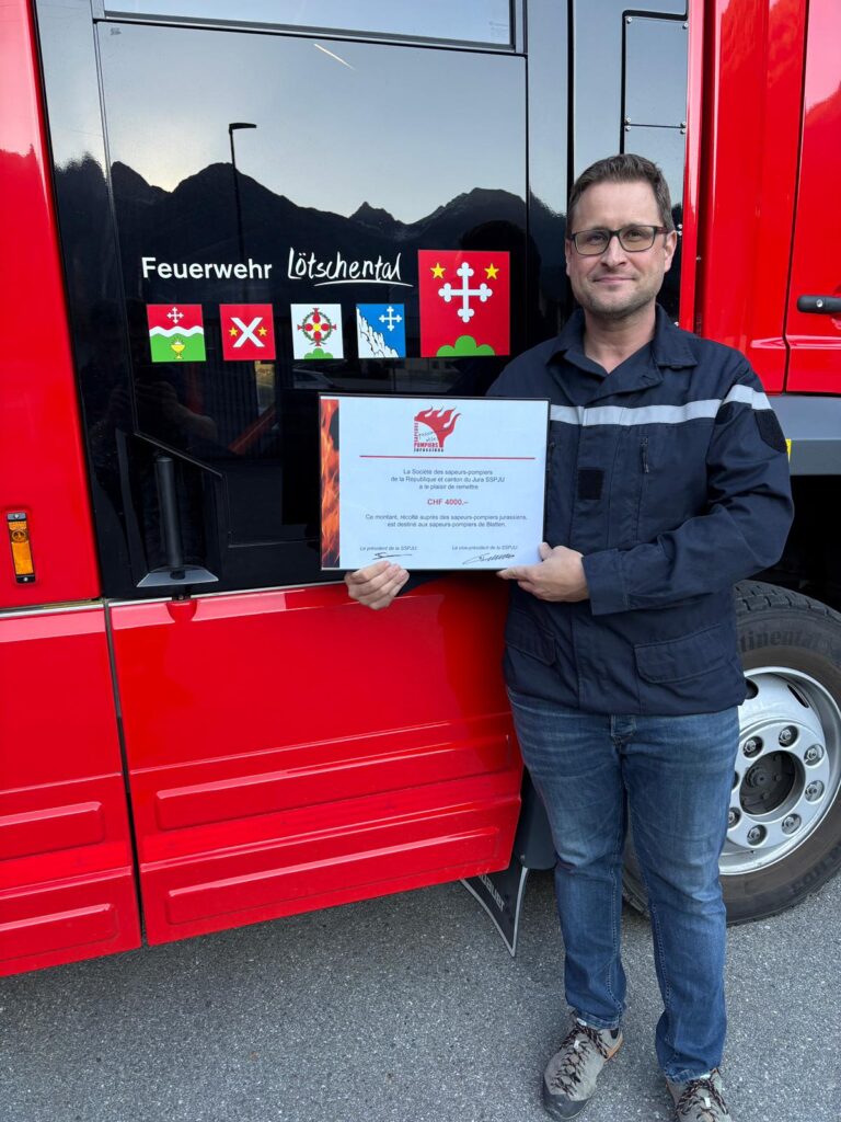 Die Feuerwehr Lötschental durfte eine grosszügige Spende in der Höhe von 4’000 Franken vom jurassischen Feuerwehrverband entgegennehmen. Der Betrag wurde von Feuerwehrleuten aus dem ganzen Kanton Jura gesammelt.